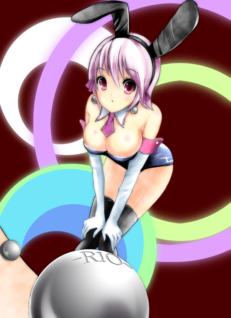 1girlanimal earsbreastscleavageelbow glovesfake animal earsfemale focusgloveshuge breastsleaning forwardnecktieplayboy bunnypurple eyespurple hairrabbit earssolothighhighs