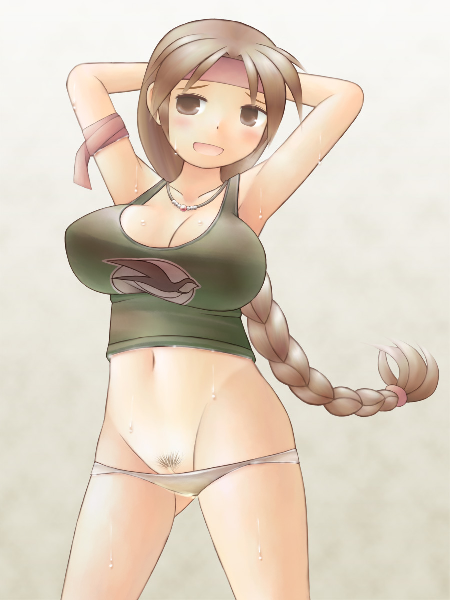 alternate breast sizearmbandarmpitsarms behind headarms upblushbreastsbrown eyesbrown haircleavagefemalefemale onlyFlag for Deletiongradient backgroundheadbandhumanlarge breastslong hairmidriffnavelnecktieno pantspantiesparted lipspeeingpeeing selfpubic hairpussysolotank topunderwearwet pantiesyoung