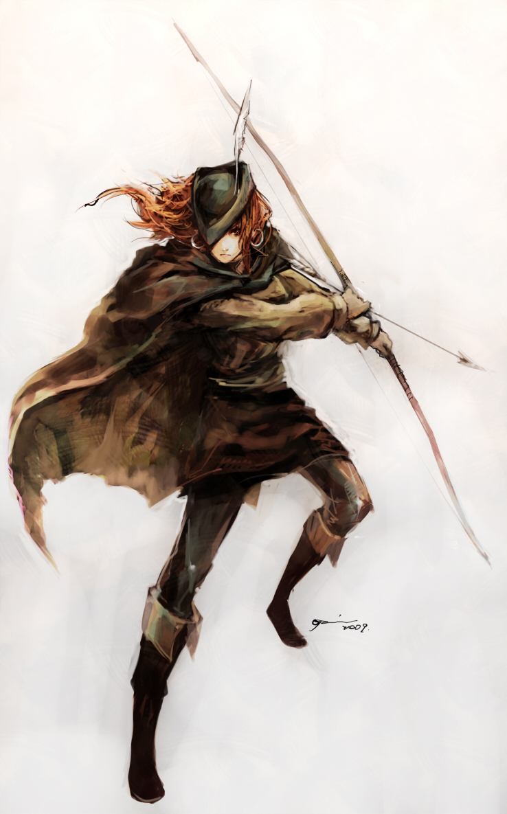 1girlaloserarrow (projectile)bootsbow (weapon)capeearringsfeathersfemale focushatjewelryred hairsoloweapon