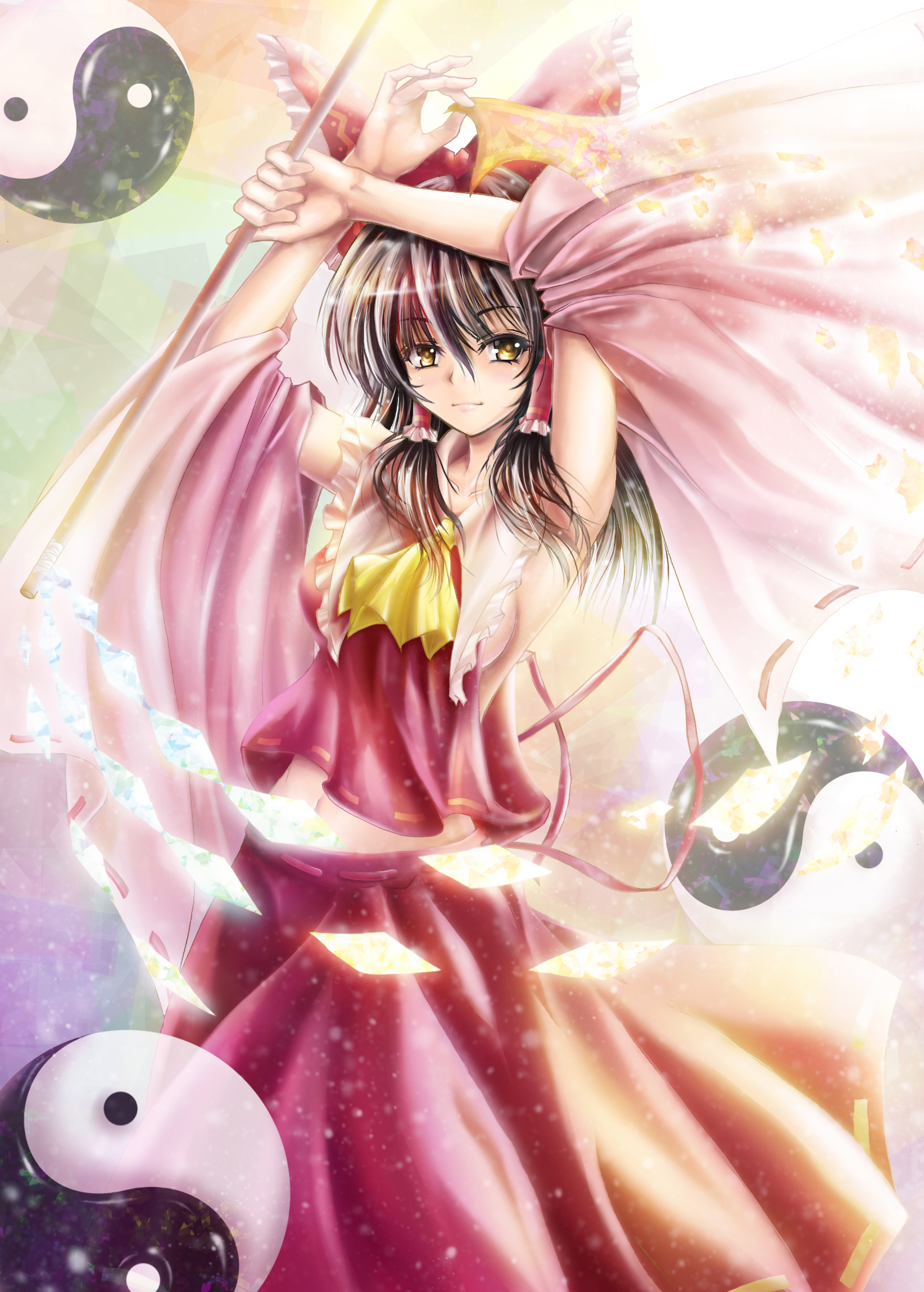 1girlarmpitsarms upbreastsbrown hairfemale focusgoheigradient backgroundmidriffno braofudasideboobskirtsoloyellow eyesyin yang