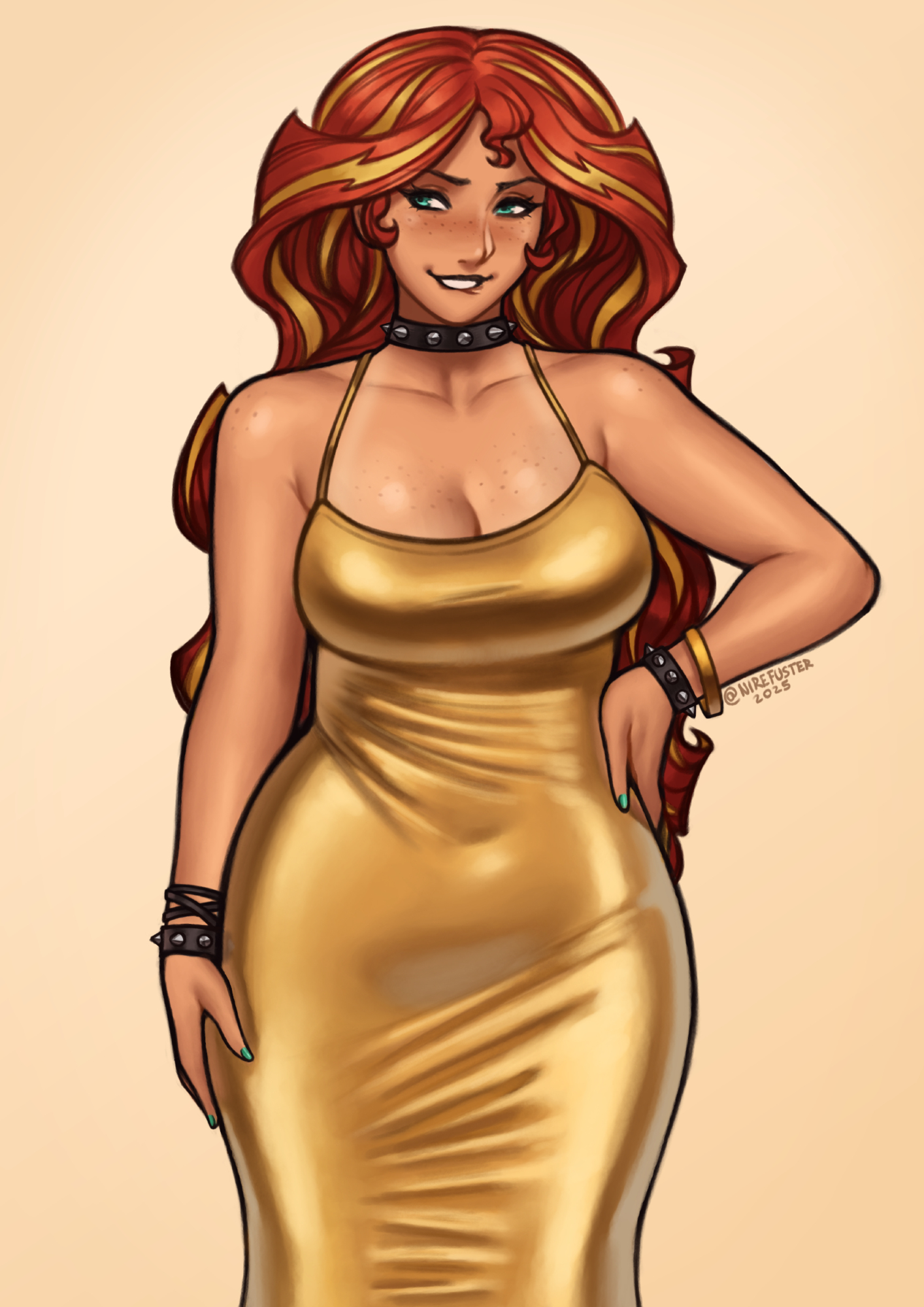 1girlaqua nailsbare shouldersbiting own lipbody frecklesbreastscleavagecollarcurvydressfrecklesgold dresshand on own hiplooking to the sidemulticolored hairsimple backgroundsolospiked collarspikestwo-tone hairwristband