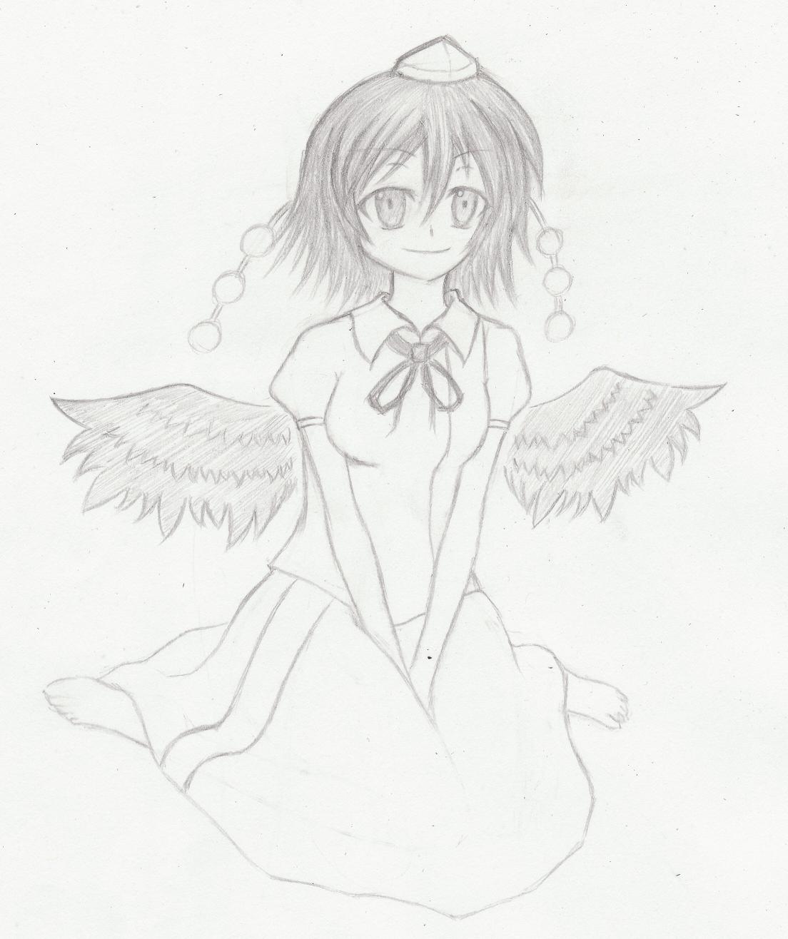 1girlbad anatomybarefootfemale focusgreyscalehatlooking at viewermonochromepoorly drawnshort hairsmilesolotokin hatwings