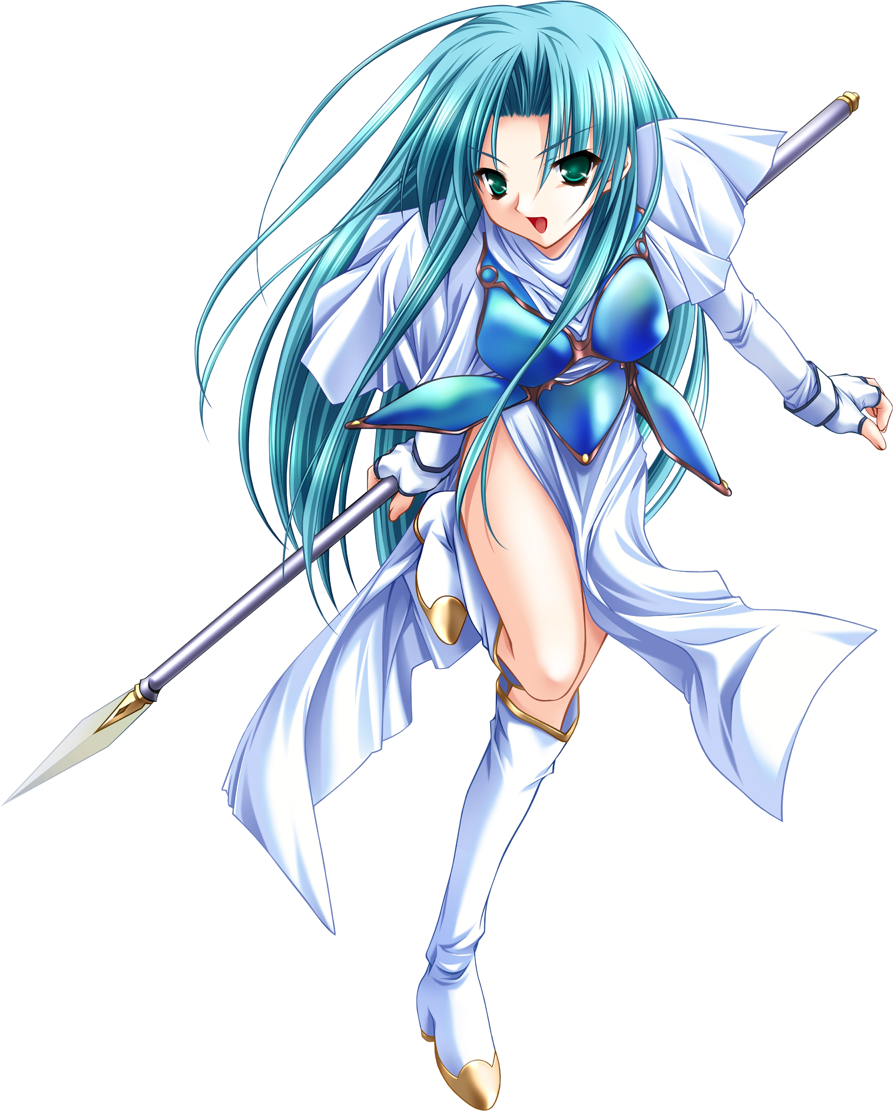1girlaqua hairarmorarmored dressbootsdressfemale focusfull bodyglovesgreen eyeslong hairopen mouthpolearmsolospeartransparent backgroundweapon