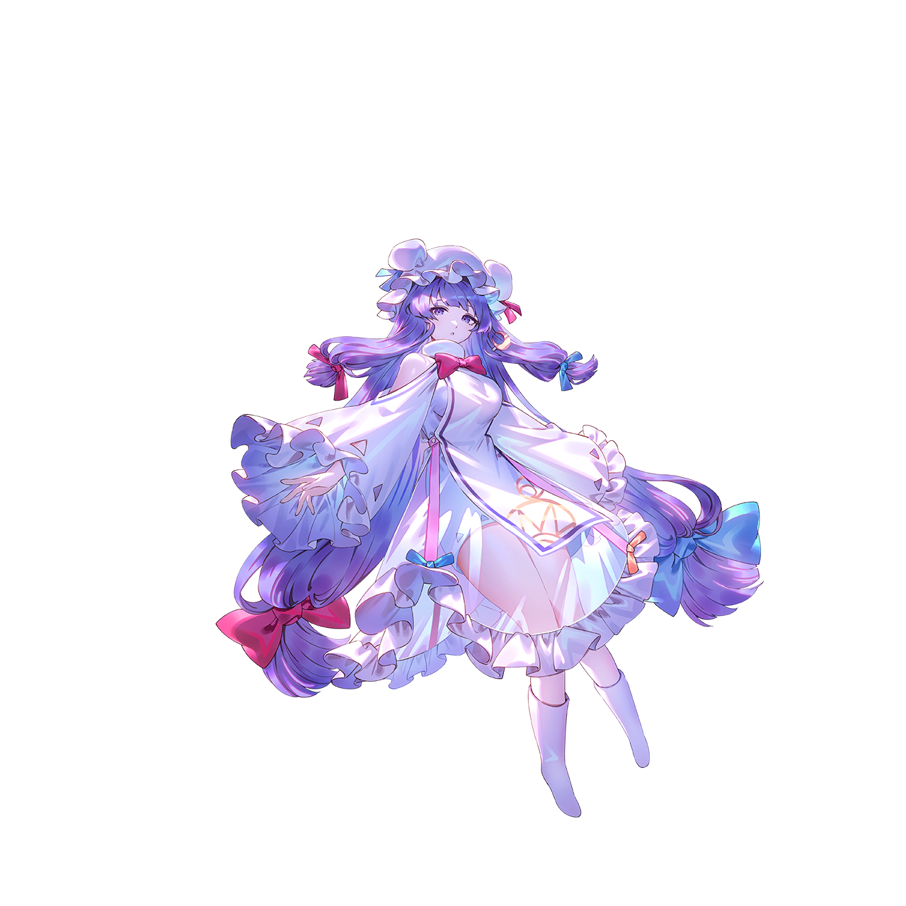 1girlalternate costumebare shouldersblue bowbootsbowbreastscrescentcrescent hair ornamentdressfull bodyhair bowhair ornamenthatlong hairlong sleeveslooking at viewermob capopen mouthpink bowpurple eyespurple hairsee-through clothessolostandingtabardthighstransparent backgroundvery long hairwhite bootswhite dresswhite tabardwide sleeves