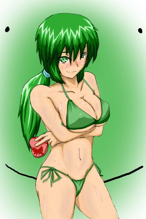 1girlbikiniblushbreastscleavagefemale focusgreen bikinigreen hairlarge breastssoloswimsuitunderboob