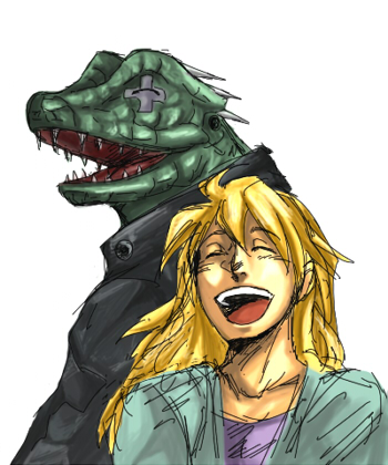 1boy1girlblonde hairclosed eyesdinosaurheight differencelaughinglizardopen mouthsharp teethsimple backgroundsketchsmiletattooteeth