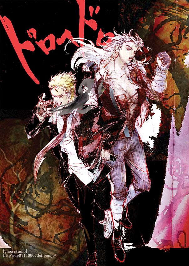 1boy1girlbreastscleavagecopyright nameformal clothesglassesgrinhammerlong hairnecktieopen mouthpartially coloredscarshoessmilesneakerssuittuxedo