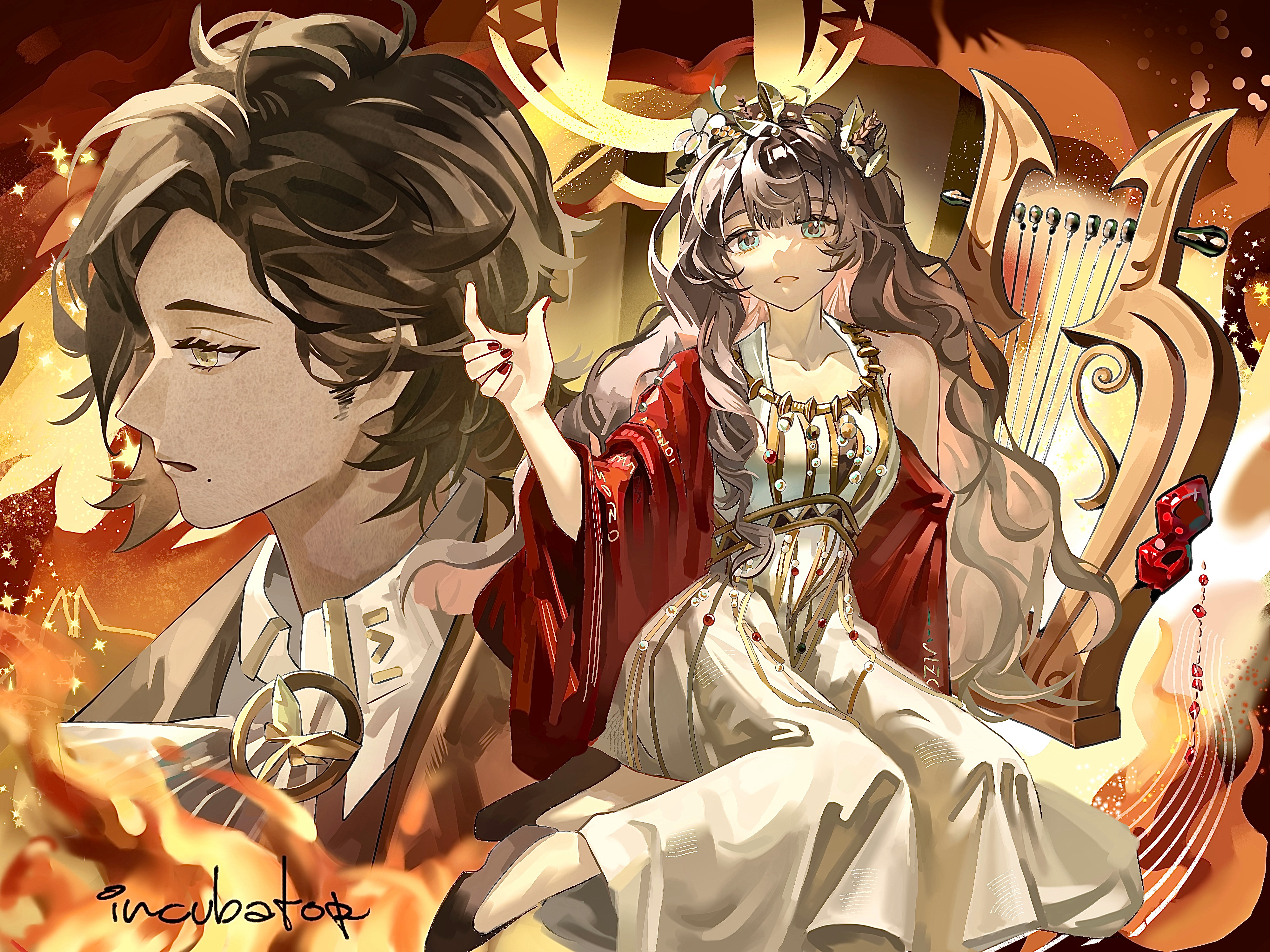 :d2girlsblack shoesblue eyesbrown coatbrown haircoatdressfiery backgroundfirefoot out of framehand upinstrumentlaurel crownlong dresslong hairlyremultiple girlsofficial alternate costumeopen mouthportraitprofilered nailsshirtshoessingle bare shouldersingle off shouldersittingsleevelesssleeveless dresssmilevery long hairwhite dresswhite shirtwu fuzuoyongyellow eyesyokozuwari