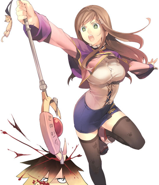 1boy1girlblack thighhighsbloodbrown hairgreen eyeslong hairpaw printpencil skirtskirtstaffthighhighs