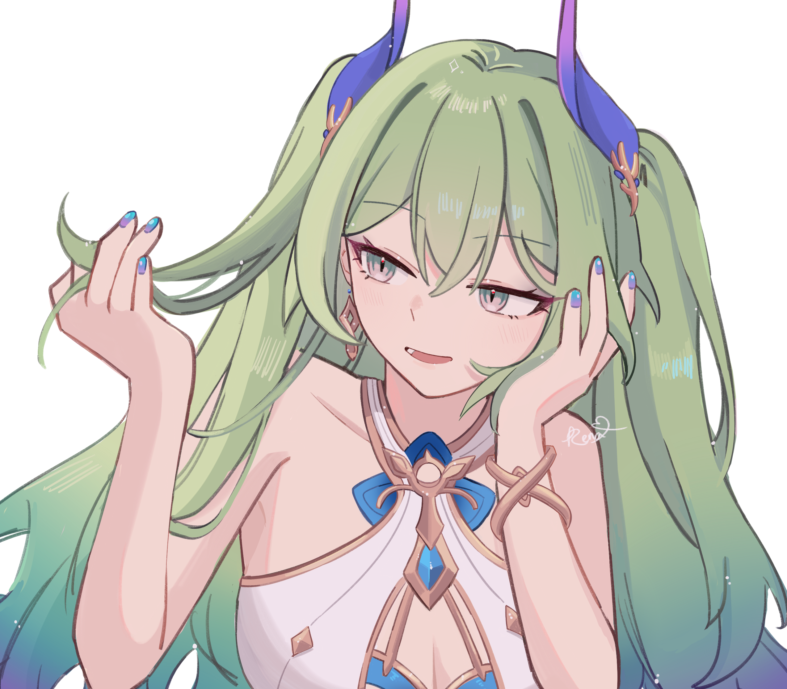 :d1girlbare armsbare shouldersblue nailsbreastsdressgreen hairhair between eyeshand uphands in own hairholdingholding own hairhornslong hairlooking to the sidemedium breastsnail polishopen mouthpurple nailssignaturesimple backgroundsleevelesssleeveless dresssmilesolotwo side upvery long hairwhite backgroundwhite dress