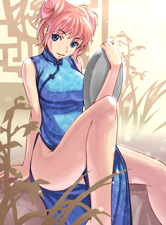 1girlbarefootblue eyesbreastschina dresschinese clothesdouble bundressfemale focuspink hairsolo