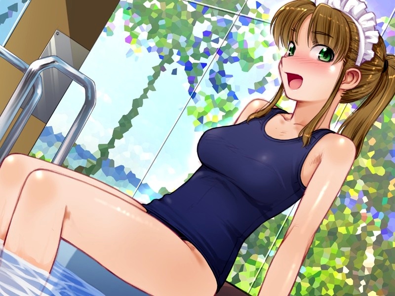 :d1girlblushbrown hairdutch anglefemale focusgreen eyeshappyindoorslong hairmaidmaid headdressone-piece swimsuitopen mouthponytailpoolpool ladderpoolsideschool swimsuitsittingsmilesoaking feetsoloswimsuitwaterwindow