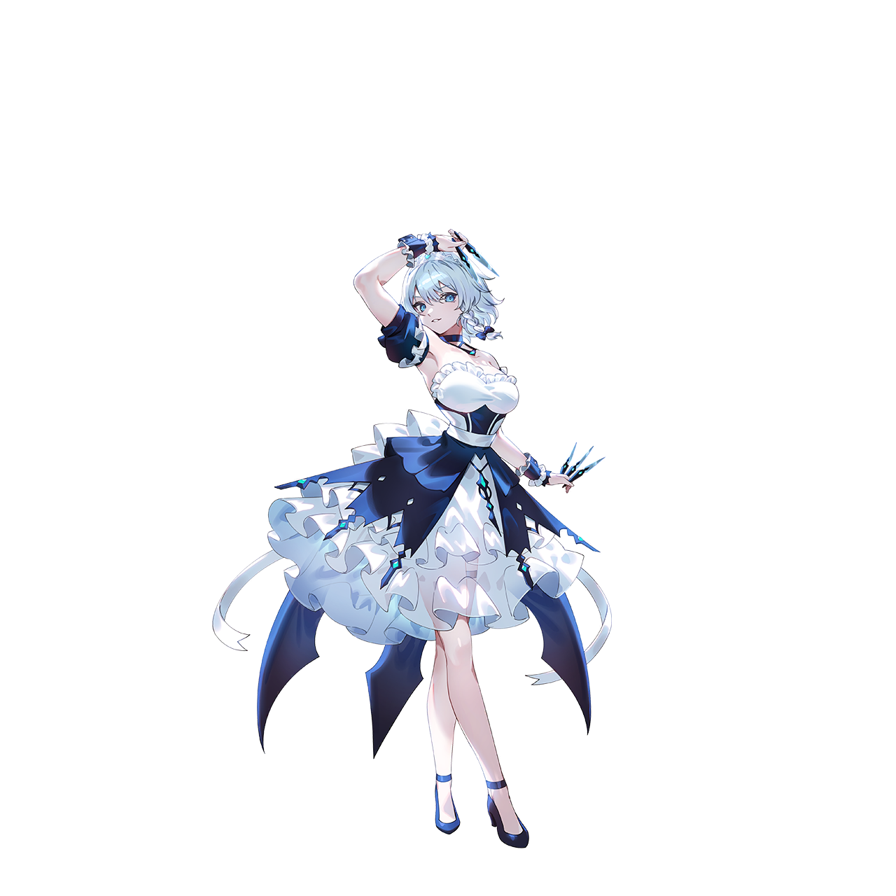 1girlalternate costumearm uparmpitsblack shoesblue bowblue chokerblue dressblue eyesbowbreastschokerdetached sleevesdressfull bodygrey hairhair bowhigh heelsholdingholding knifeknifelarge breastslooking at viewermaid headdressmedium hairparted lipsshoessolostandingstraplessstrapless dressthrowing knifetransparent backgroundweaponwhite dresswrist cuffs