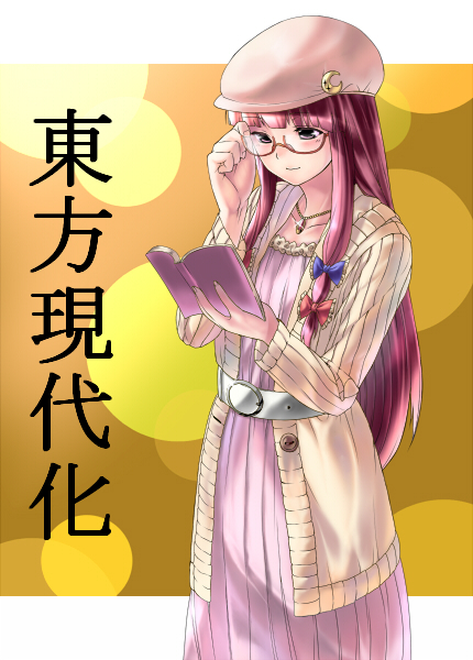 1girladjusting eyewearalternate costumeberetbespectacledbookcasualcontemporarycrescent hat ornamentfemale focusglasseshathat ornamentlong hairpurple hairsolo