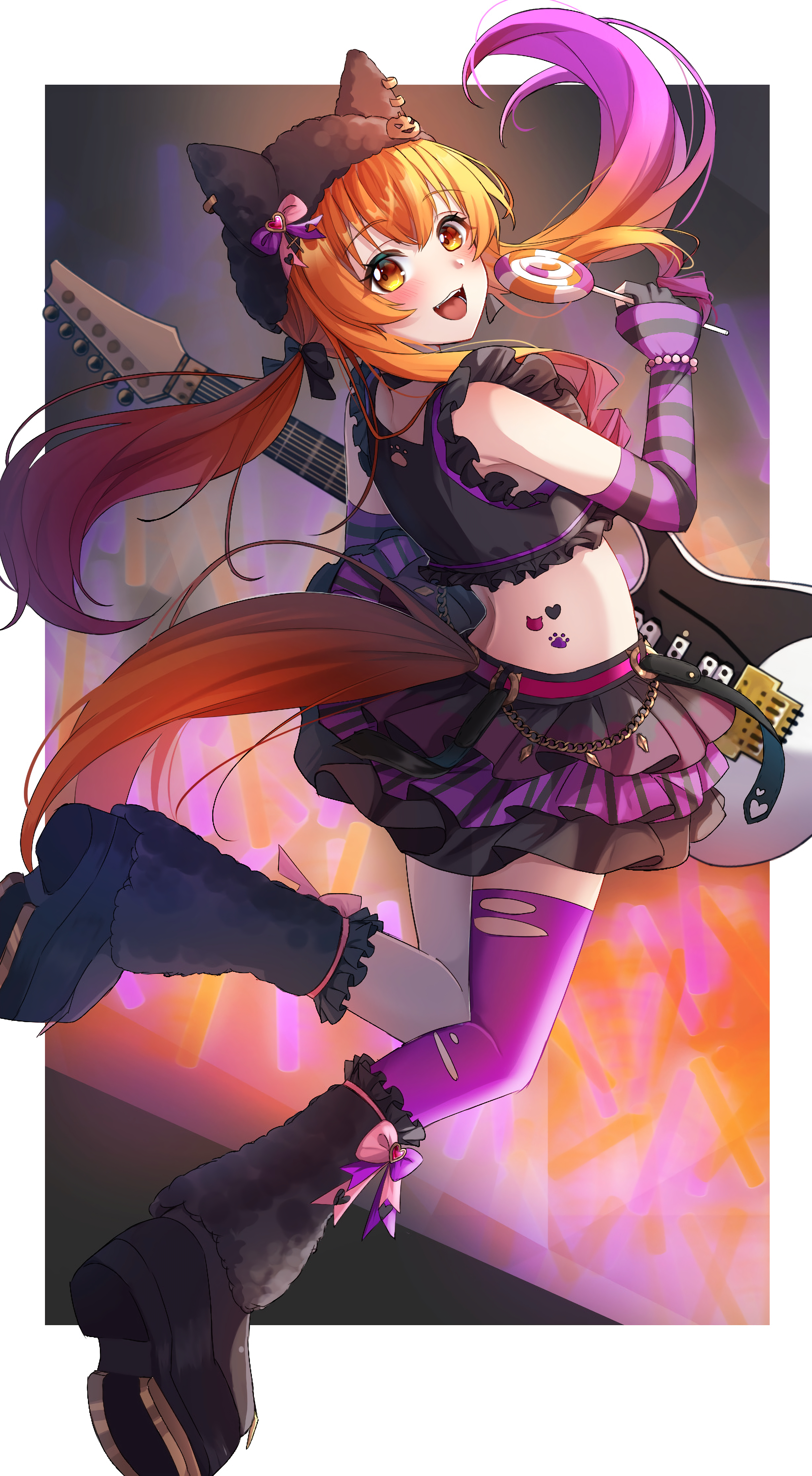 1girlanimal earsarm warmersblack leg warmersblack shirtblack shoesblack skirtcandycrop topears under headwearfoodfretless bass guitarfretless instrumentfrilled skirtfrillsfrom behindgradient hairholdingholding candyholding foodholding lollipophorse earshorse girlhorse tailhorseshoeleg warmerslollipoplong hairlooking at viewerlow twintailsmidriffmulticolored hairofficial alternate hairstyleopen mouthorange eyesorange hairorange tailpumpkin hat ornamentpurple arm warmerspurple hairpurple thighhighsshirtshoessingle thighhighskirtsmilesolostriped arm warmersswirl lollipoptailthighhighstorn clothestorn thighhighstwintailsyume 30 31