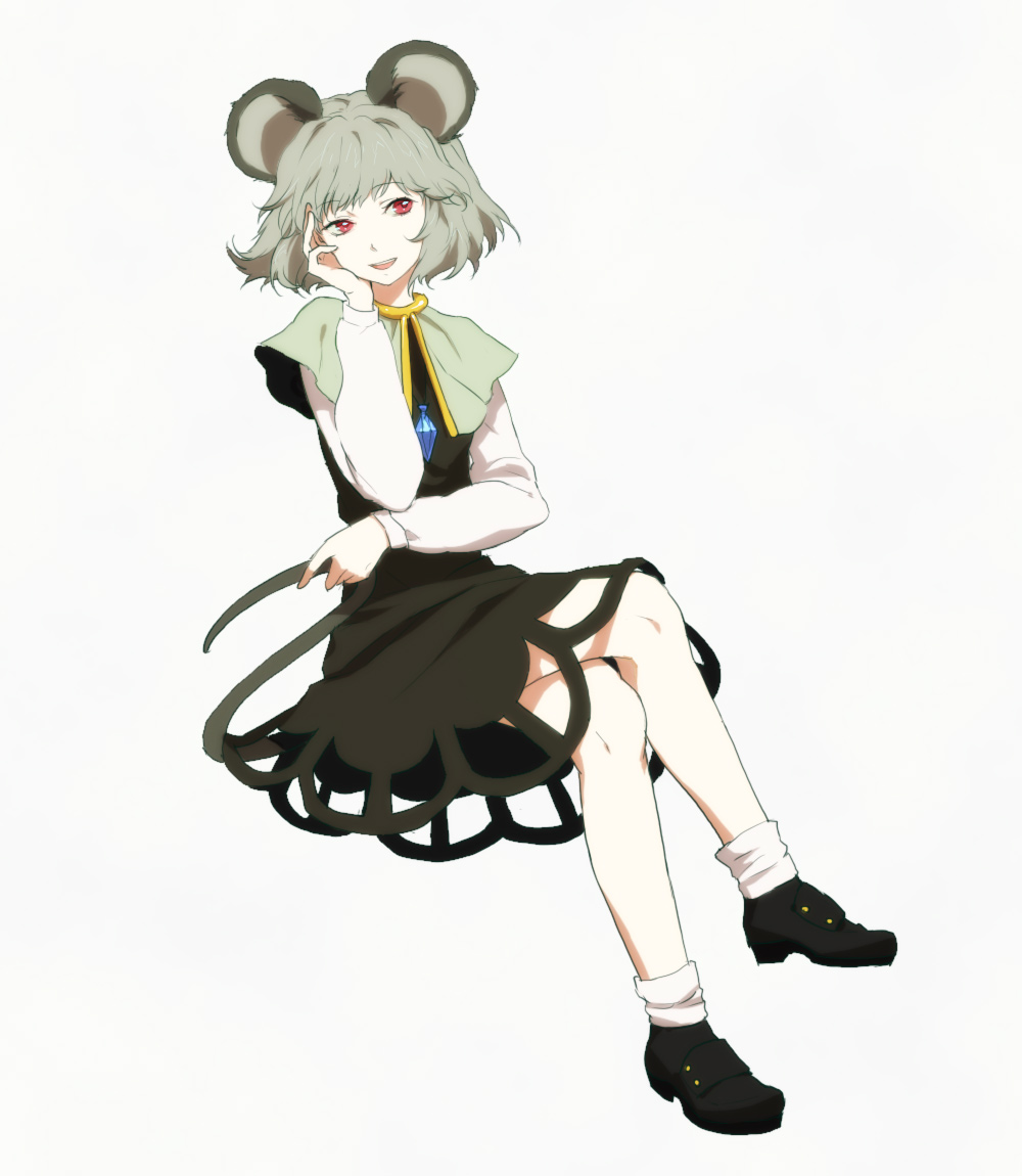 1girlanimal earscrossed legsfemale focusgrey hairhead resthugging tailmouse earsmouse tailred eyesshort hairsittingsmirksolotail