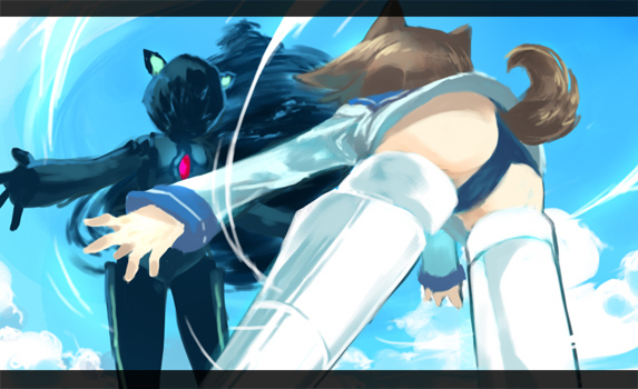 satomi (black scarecrow), bonta-kun, hiiragi kagami, full metal panic!, lucky star, 00s, 1girl, female focus, no shoes, purple hair, school uniform, serafuku, sitting, solo, stuffed animal, stuffed toy, thighhighs, twintails
