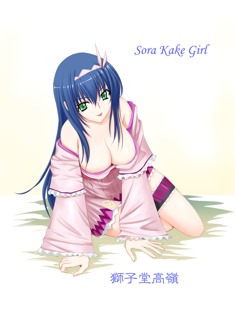 00s1girlarm supportbare shouldersblue hairbreastscleavagedownblousefemale focusgreen eyeshairbandhuge breastslegslipsticklong hairmakeupsolo