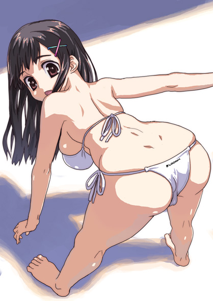 :o1girlassbarefootbent overbikiniblack hairbreastsbrown eyescurvydimples of venusfeetfemale focusfrom abovefrom behindhair ornamenthaircliphands reach floorhuge breastslong hairlooking backshadowside-tie bikini bottomsideboobsolostretchingswimsuitwhite bikini