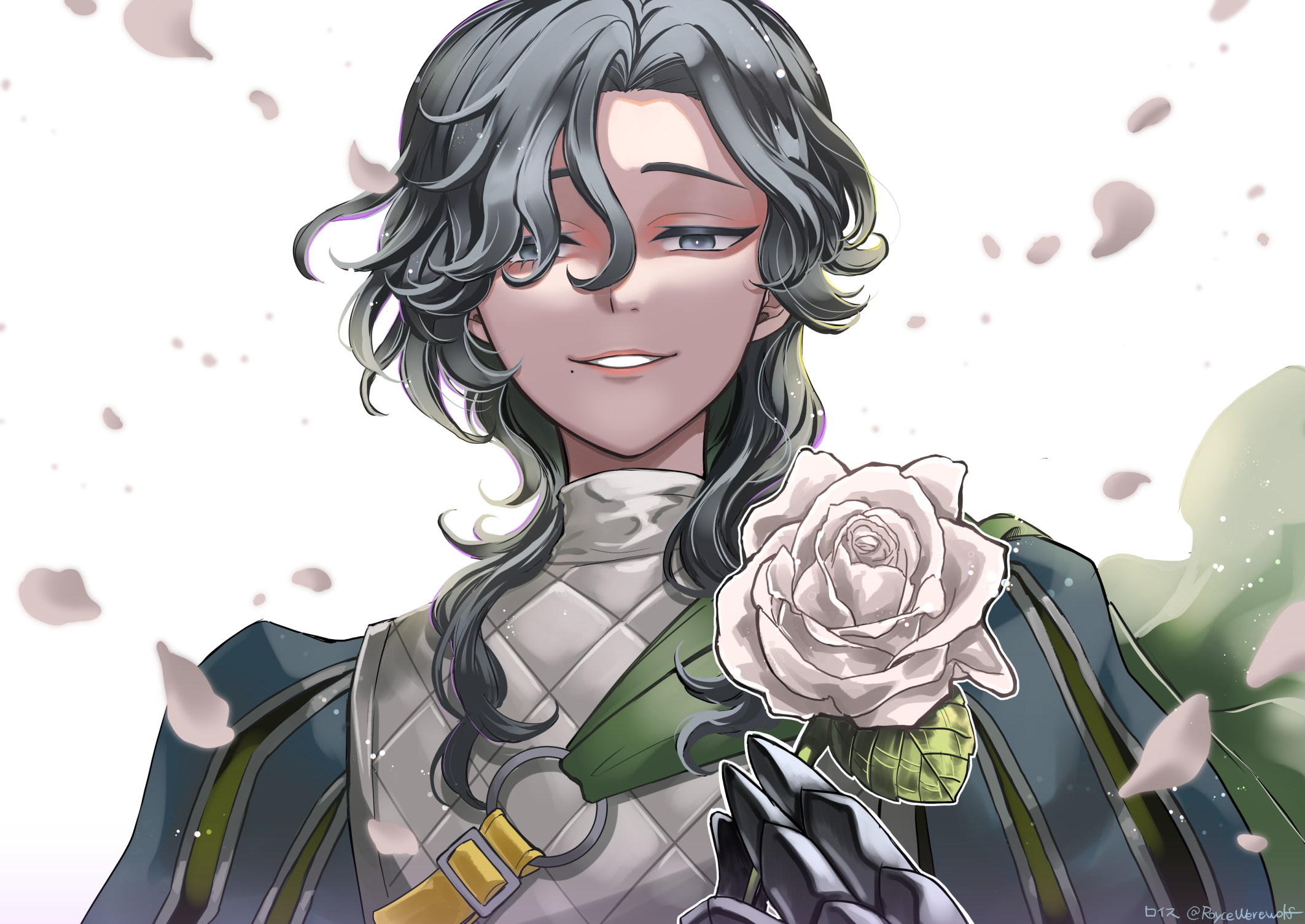 1boyarmored glovesbright pupilsfalling petalsflowergrey eyesgrey hairhalf-closed eyesholdingholding flowerlooking at viewermale focusmedium hairmolemole under moutho-ringpetalsrichard sterlingsoloupper bodywhite backgroundwhite flowerwhite pupils