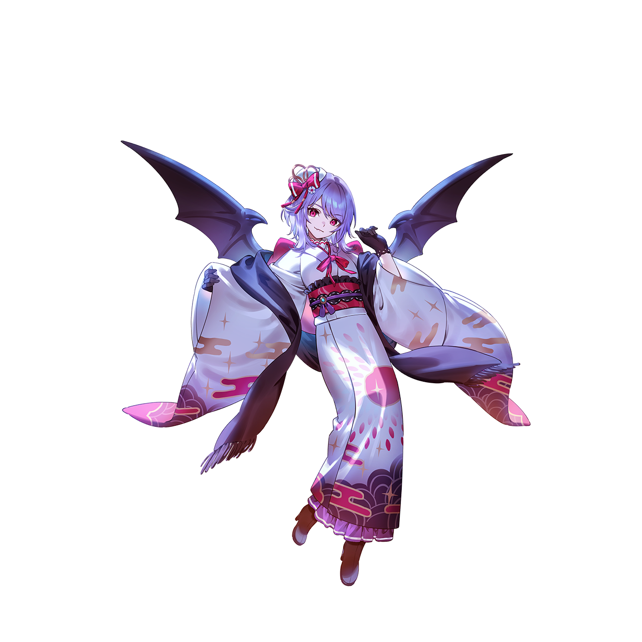 1girlalternate costumeapronbat wingsblack glovesblack scarfbowclosed mouthcloudcloud printegasumifurisodegloveshatjapanese clotheskimonolight smilelong hairlong sleeveslooking at viewermulticolored kimonoobiobiageobijimeprint kimonopurple hairred eyesred sashsashscarfsolotransparent backgroundwhite kimonowide sleeveswings