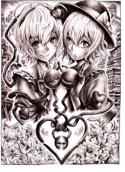 karasuma chitose, milfeulle sakuraba, broccoli (company), galaxy angel, absurdres, highres, official art, scan, translation request, 00s, 2girls, blue eyes, blue hair, blush, copyright name, floral background, flower, hair flower, hair ornament, happy, long hair, looking at viewer, moire, multiple girls, one eye closed, open mouth, pink hair, puffy sleeves, smile, text focus, wink