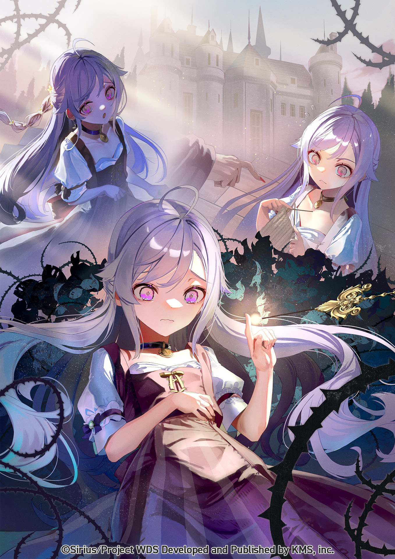3girlsahogebare shouldersblushbreastschokercleavageclosed mouthcollarbonehalterneckhands on own chestlong hairlooking at viewermultiple girlspink eyespurple eyespurple hairwatermark