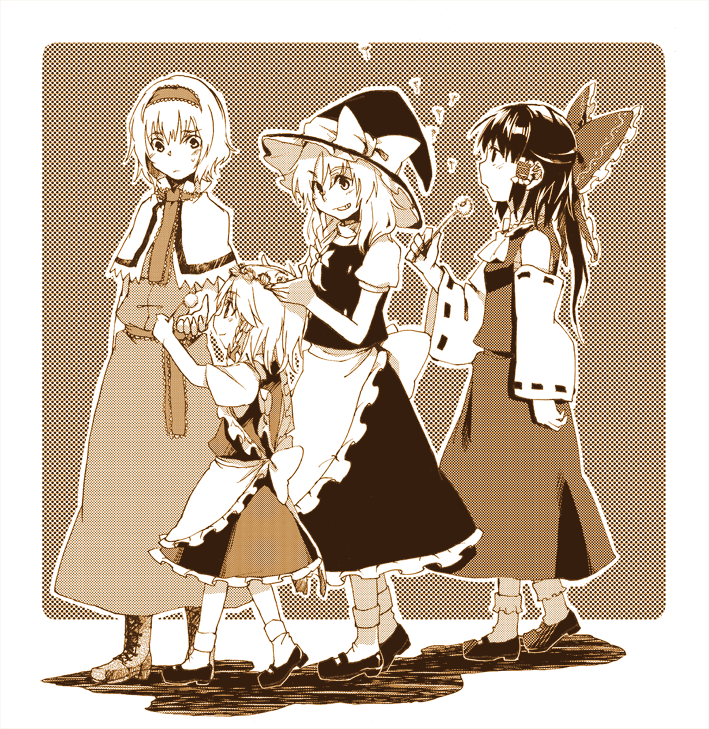 4girlsaged downapronascotbobby socksbootsbowbraidbrown themecapeletdandeliondetached sleevesdressfemale focusflowerhair bowhair tubeshairbandhalftonehathat bowhead wreathlace-up bootsmary janesmonochromemultiple girlsscreentonessepiashoesside braidskirtskirt setsockstime paradoxwitch hat