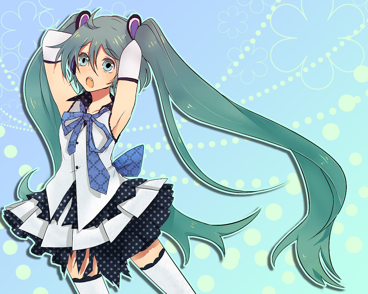 :oaqua eyesarmpitselbow glovesglovesgreen hairlong hairnecktieopen mouthskirtsolothighhighstwintailsvery long hairwhite thighhighs