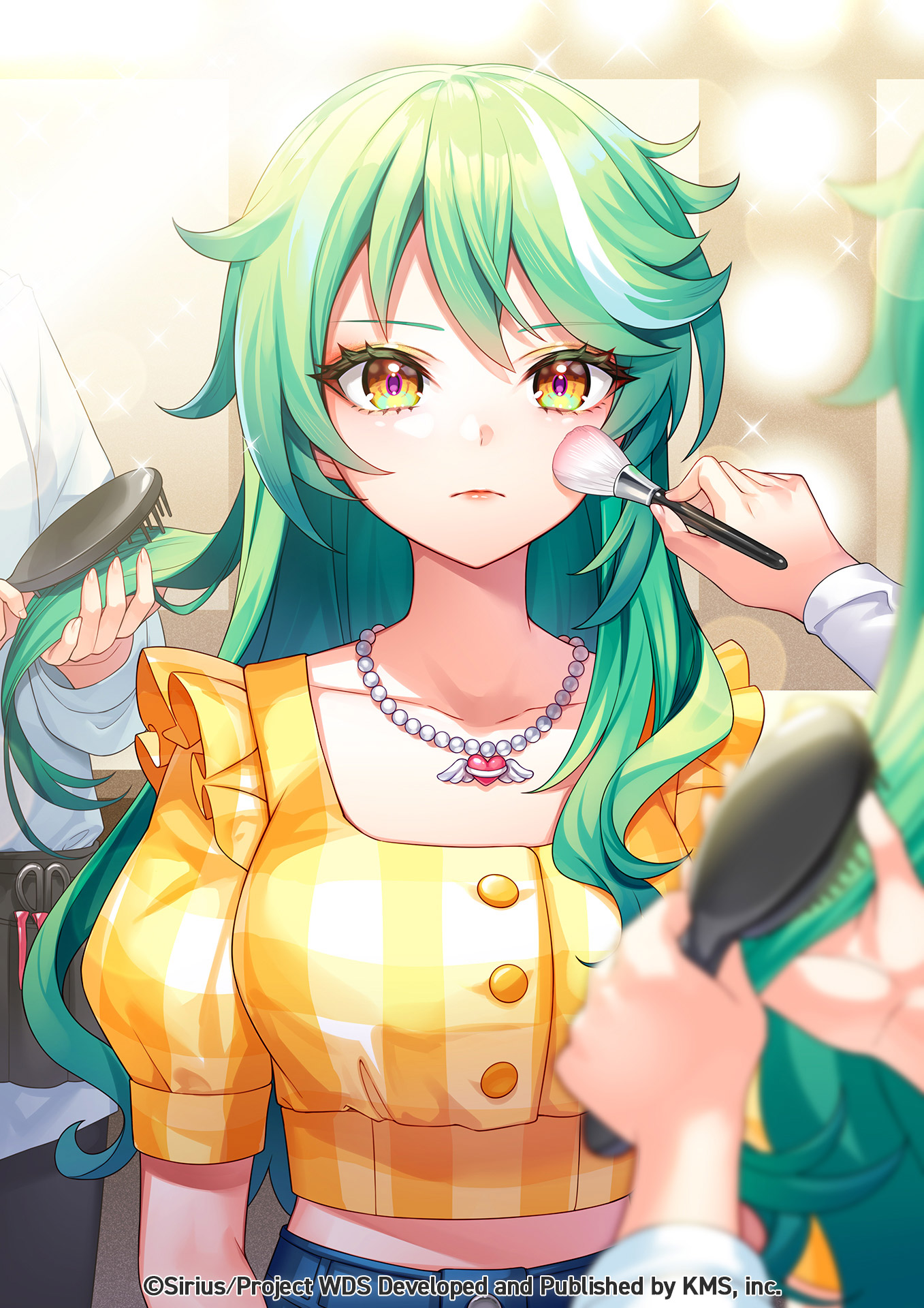 1boyblurryblurry foregrounddepth of fieldgreen hairholdingindoorsjewelrylong hairlooking at viewermirrornecklaceout of framepoutpovpov handsshirtsparklespoontoothbrushwatermark