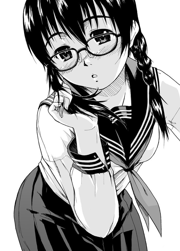 1girlbraidfemale focusglassesgreyscalehair over shoulderholdingholding own hairmonochromeschool uniformserafukusolotwin braids