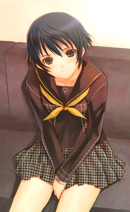 ryp, sasamori karin, to heart (series), to heart 2, 00s, 1girl, blonde hair, blue eyes, blush, female focus, food-themed hair ornament, hair ornament, long sleeves, looking at viewer, low twintails, orange hair, pointing, pumpkin hair ornament, sailor collar, school uniform, serafuku, short twintails, solo, spiked hair, twintails, upper body