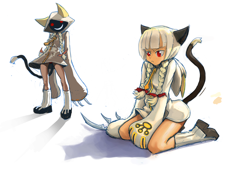 1girlanimal earsanimal hoodbraidcat hoodclawsgrinhoodhoodiered eyessmiletailtwin braidswhite hair