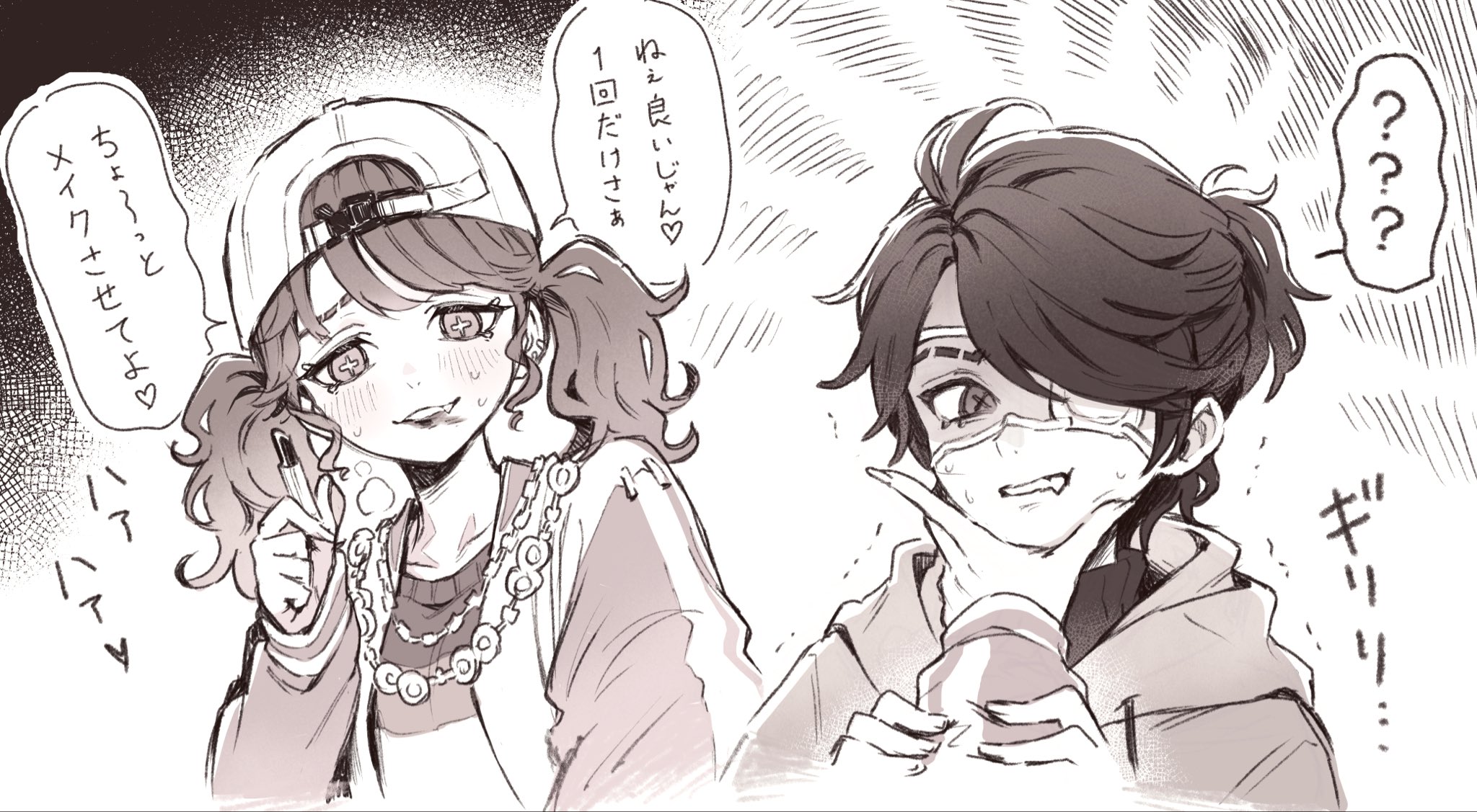 haishiki, ophelia von margeline, sanjou hiiro, danshi kinsei game sekai de ore ga yarubeki yuiitsu no koto yuri no ma ni hasamaru otoko to shite tensei shite shimaimashita, commentary request, highres, 2girls, bare shoulders, blonde hair, blue dress, blue eyes, blue flower, blue gemstone, breasts, brown eyes, crossdressing, crossdressing (mtf), dress, floral print, floral print dress, flower, folding fan, gem, grin, hair flower, hair ornament, hand fan, hat, hirabitai, holding, holding fan, holding flower, japanese clothes, jewelry, kanzashi, karaginu mo, kimono, large breasts, layered kimono, long hair, multiple girls, multiple piercings, nanatsubaki (yurihasa), necklace, pointy ears, print dress, print kimono, purple eyes, purple hair, ringlets, smile, sundress, very long hair, white dress, white hat, wings