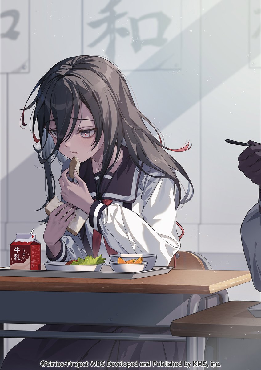 1girlblack hairchaireatingfoodhair between eyesholdingholding foodindoorslong hairlong sleevesneckerchiefsailor collarschool uniformserafukushirtsittingsolo focusspoontable