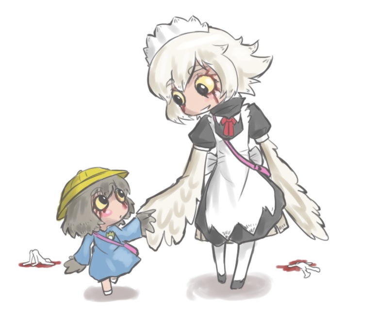 2girlsbloodchilddeathharpyhatkindergartenkindergarten uniformmaidmonster girlmultiple girlsschool hatsimple backgroundtop-down bottom-upwhite backgroundwinged armswings