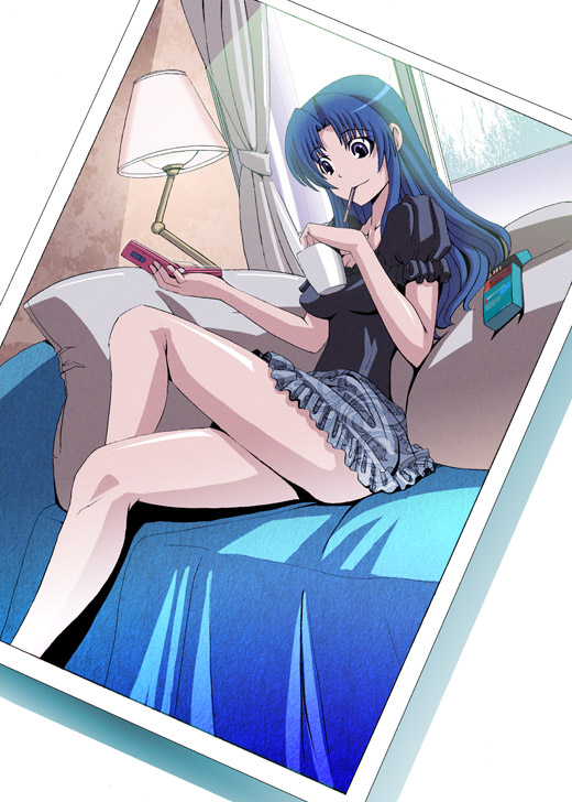 sato ruka, izumi hiyori, hamidashi creative, absurdres, chinese commentary, commentary request, highres, 1girl, :d, ahoge, animal collar, animal ear fluff, animal ears, animal hands, arm at side, blonde hair, blue bow, blush, blush stickers, bow, bowtie, breasts, buttons, cleavage, collar, curtains, day, diamond button, dog ears, dog tail, double-breasted, double bun, eyelashes, eyes visible through hair, fake animal ears, fake tail, fang, frilled skirt, frills, full body, gloves, grey skirt, hair between eyes, hair bow, hair bun, hair intakes, hand up, indoors, large breasts, long hair, long sleeves, looking at viewer, miniskirt, on bed, open clothes, open mouth, open shirt, paw gloves, paw print, pink collar, pleated skirt, red bow, red bowtie, red eyes, school uniform, shirt, sitting, skin fang, skindentation, skirt, smile, solo, straight hair, tail, thigh strap, thighs, two-tone skirt, two side up, very long hair, white shirt, white skirt, window, yokozuwari