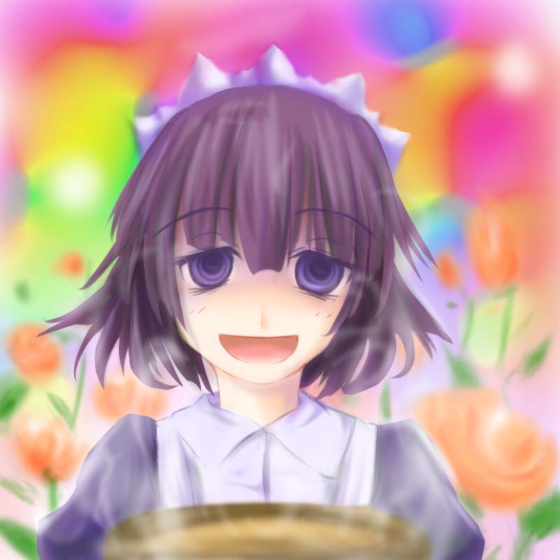 1girlblue eyesfemale focusflowerfoodlong sleeveslooking at viewermaid headdresspuffy long sleevespuffy sleevespurple eyespurple hairroseshort hairsmilesolosoupsteamstonedupper body