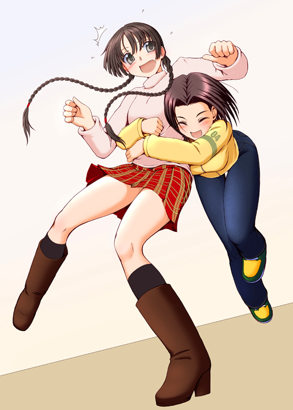 00s2girlsblack socksblushbootsbraidbrown haircasualdenimfriendshughug from behindjeanskneehighslong hairmultiple girlsno nosepantsplaid clothesplaid skirtshort hairskirtsockssurprisedtwin braids