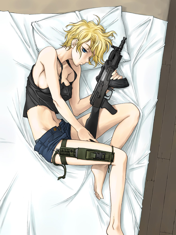 1girlaks-74uassault riflebarefootbedblonde hairblue eyesdenimdenim shortsfeetfemale focusgunkalashnikov riflekniferifleshort hairshort shortsshortssolostray bulletstank topthigh strapweapon