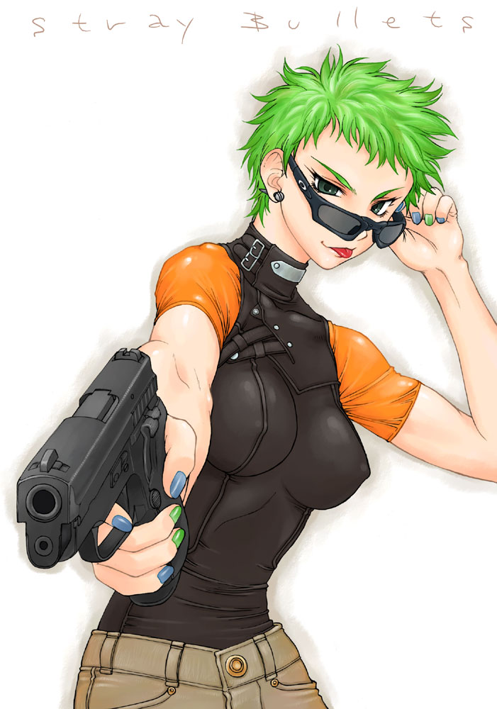 1girlblue nailsbreastscovered erect nipplesfemale focusgreen hairgreen nailsgunhandgunlarge breastsmulticolored nailsnail polishpistolshort hairsolostray bulletssunglassesweapon