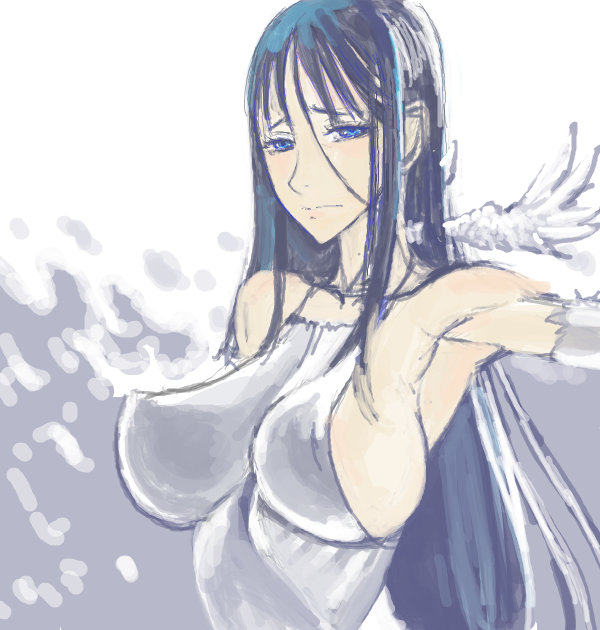 1girlangel wingsarmpitsbare shouldersblue eyesblue hairbreastsbreasts apartcovered erect nipplesdetached sleevesdresselbow glovesembarrassedfemale focusgloveshair between eyesimpossible clothesimpossible dressimpossible shirtlarge breastslong hairlooking at viewerlooking backmagical girlmatching hair/eyesoutstretched armsperky breastsprofileribsshirtsideboobsidelockssimple backgroundsketchsoloupper bodyvery long hairwings