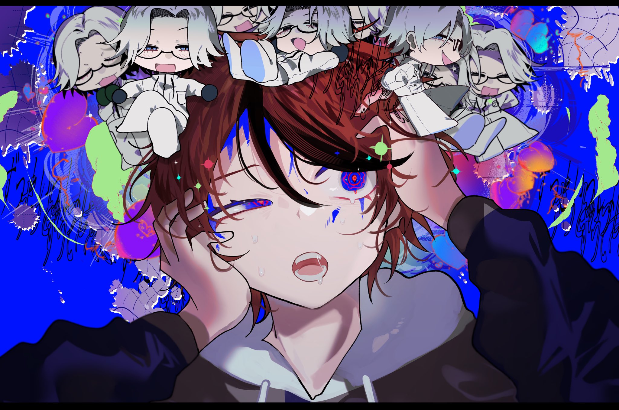 :d6+boysabstract backgroundbad anatomybad handsblack glovesblack streaksblue eyesblue liquidchibichibi on headcolorfulfangsglassesglovesgrey hairgrinhair intakeshalf-closed eyehand on own headhead tilthoodhood downjacketlooking at viewerlooking to the sidemale focusmulticolored eyesmultiple boysmultiple personanadumekoon headopen mouthpantsportraitpurple eyesred eyesred hairsalivasemi-rimless eyewearshort hairsingle tearsmilesweatwhite jacketwhite pants