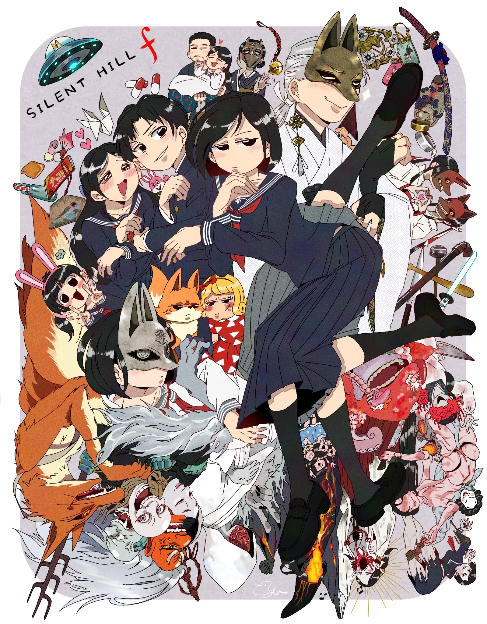 animal ear hairbandanimal earsbellblack hairblack serafukublack socksblushcopyright namedoll jointsdual personafake animal earsfoxfox maskfox servants (silent hill f)grey skirthairbandheartheart handsheart hands duojapanese clothesjointskinuta junkomaskmismatched armsmonsterneckerchiefopen mouthpleated skirtrabbit earsred neckerchiefschool uniformserafukushimizu hinako (white sailor school uniform)shimizu kantashimizu kimiesignatureskirtsmilesocksswordufovweaponwhite hair