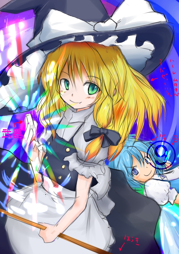 2girlsblonde hairblue eyesblue hairbowcircled 9female focusgreen eyeshatmultiple girlsshort hairwitchwitch hat遶ュ・ィ