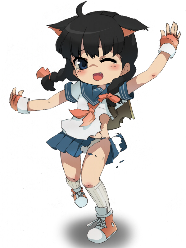 ahogeanimal earsblue eyesblushbraidbrown hairfangfingerless glovesglovespantiesschool uniformshoesskirtsneakerssockssolotearstorn clothestwin braidsunderwear