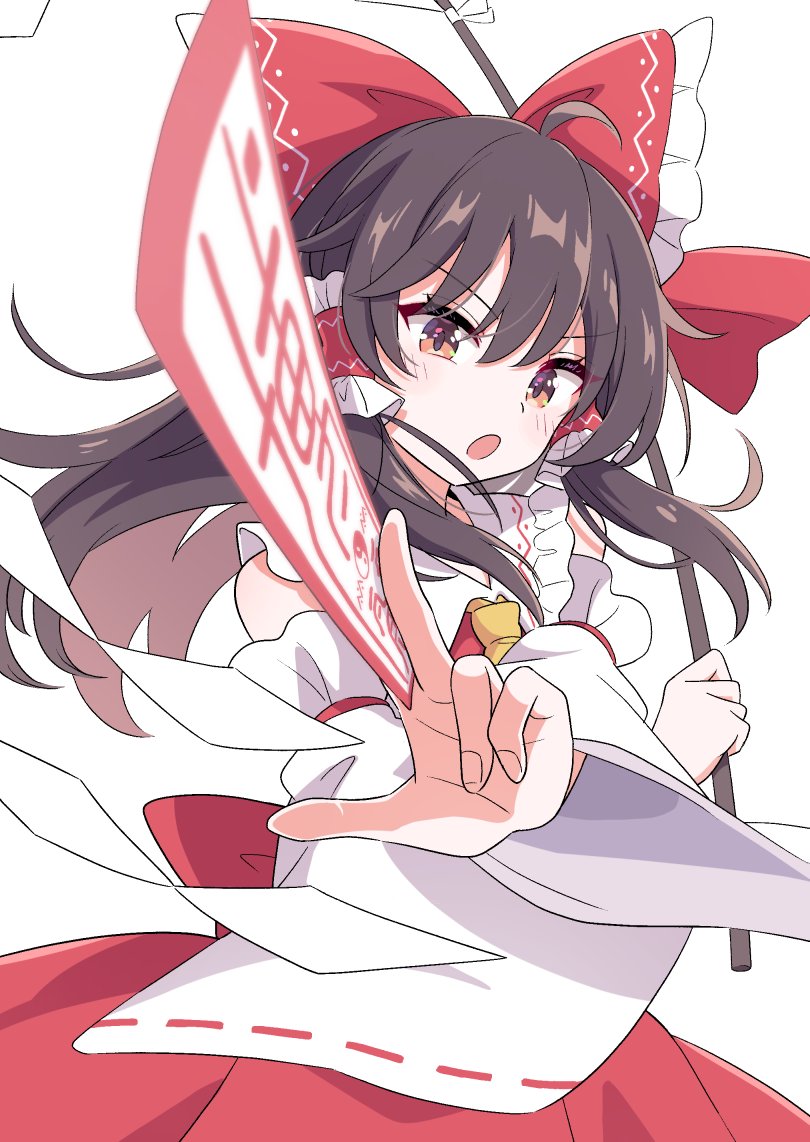 1girlascotbare shouldersblushbowbrown eyesbrown hairdetached sleevesfrilled bowfrilled hair tubesfrillsgoheihair bowhair tubesholdinglong hairlooking at viewernontraditional mikoofudaopen mouthred bowribbon trimribbon-trimmed sleevessidelockssimple backgroundsoloupper bodywhite backgroundwhite sleeveswide sleevesyellow ascot