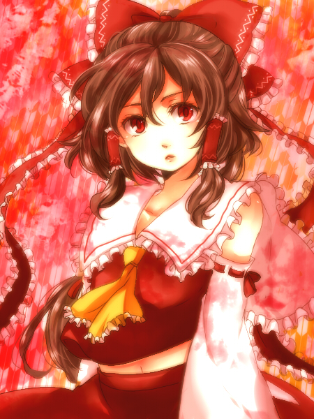 muraya yoshihisa, takamachi nanoha, takamachi nanoha (sacred mode), lyrical nanoha, mahou shoujo lyrical nanoha, mahou shoujo lyrical nanoha strikers, 00s, 1girl, bare legs, bare shoulders, bow, bowtie, brown hair, closed eyes, dress, female focus, hair ribbon, hand on own head, long hair, long sleeves, magical girl, orange hair, red bow, red bowtie, ribbon, sideways, sky, solo, twintails