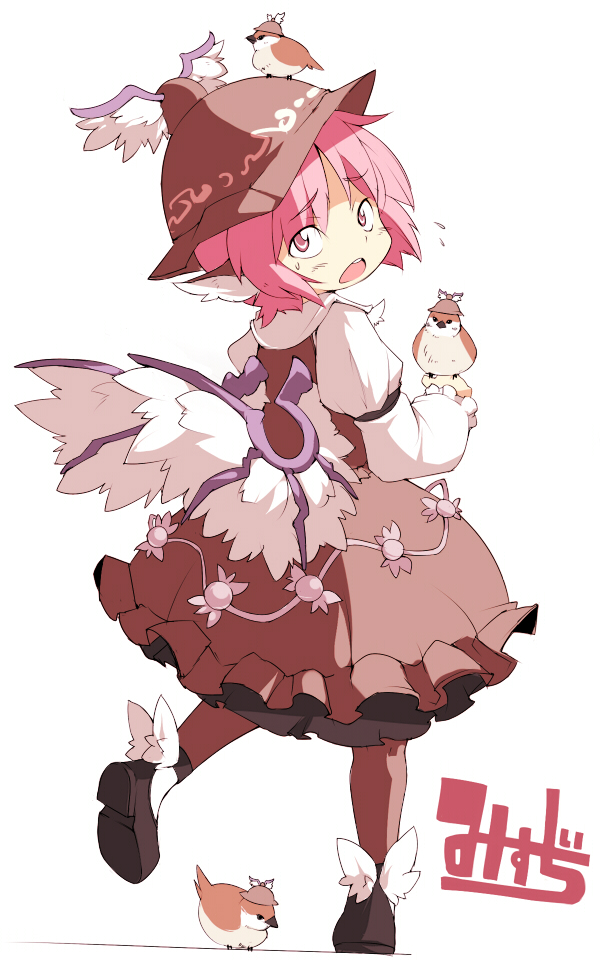 1girlanimalanimal earsanimal on headbirdbird on handbird on headfemale focushaton headpink eyespink hairsolowings