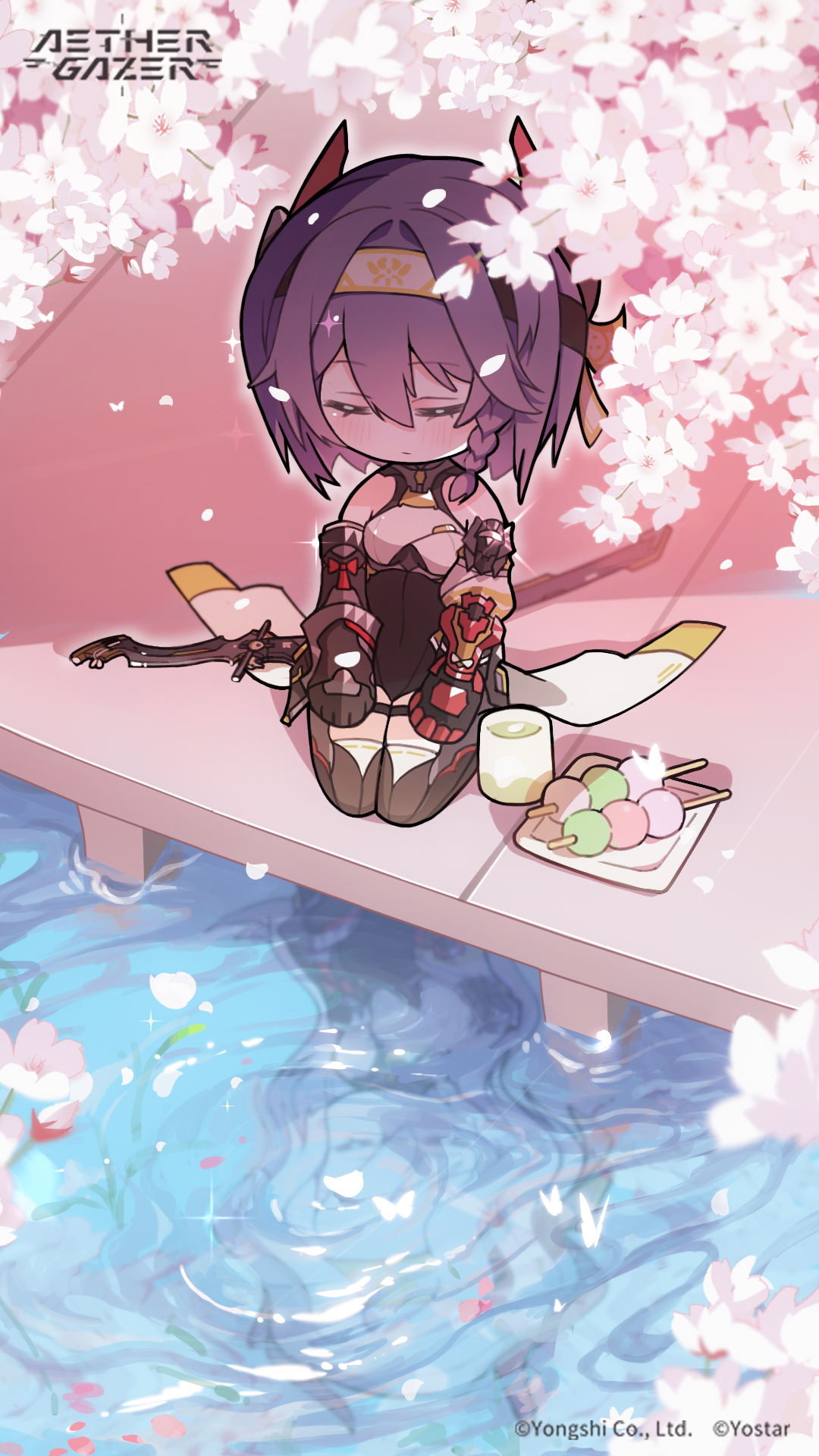 1girlasymmetrical glovesblack glovesblack thighhighsbraidbuzenbo tenguchibiclosed eyesclosed mouthcopyright namecopyright noticedangoflowerfoodglovesgreen teajapanese clotheskneelingmismatched glovespetalspetals on liquidpurple hairred glovessanshoku dangosoloteathigh strapthighhighswagashiwaterwhite flowerwhite petals